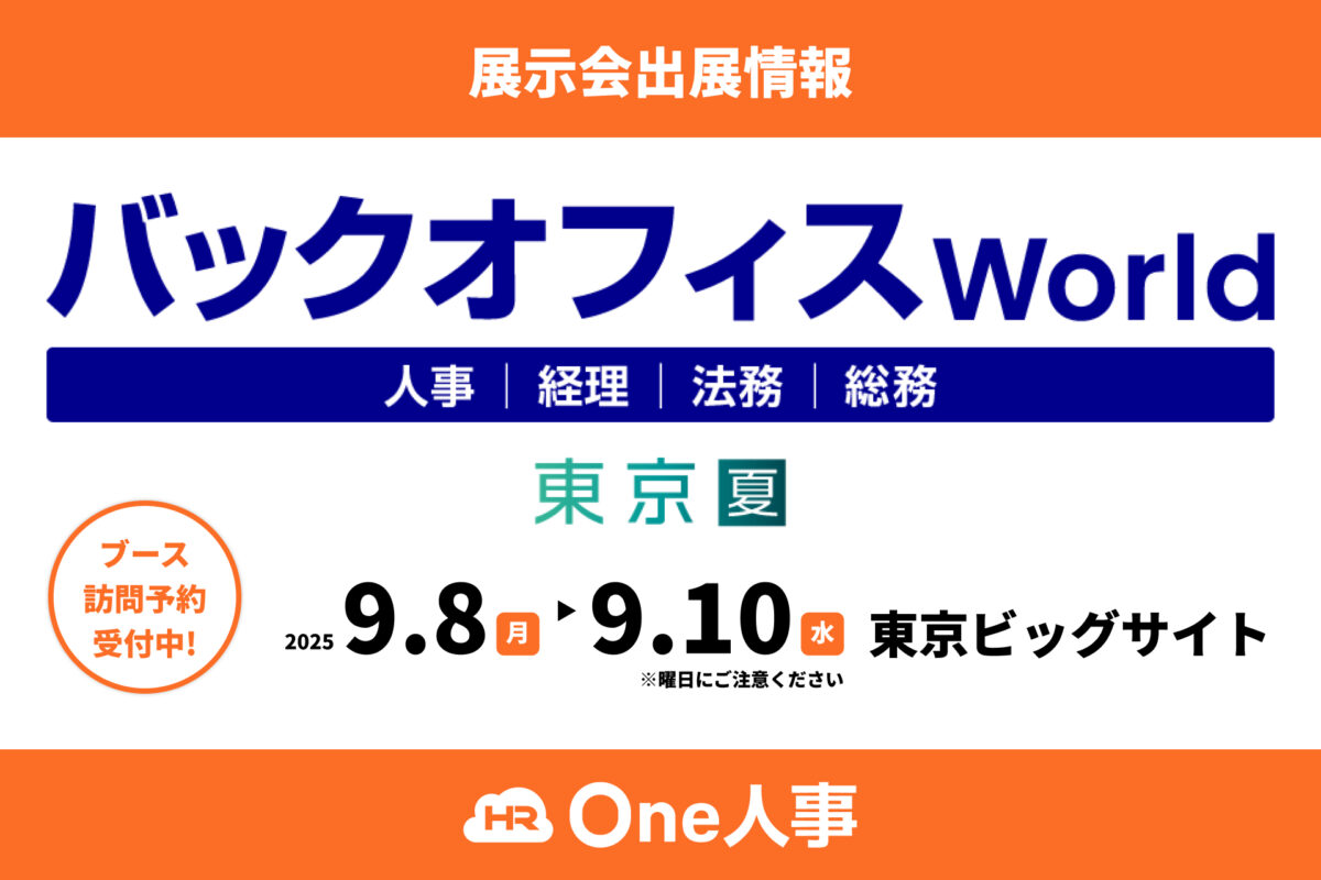 ワンストップ人事労務システム「One人事」を提供するOne人事株式会社(本社:東京都品川区、代表取締役社長:唐沢雄三郎)は、9月に開催される「バックオフィスWorld 2025 夏 東京」に出展いたします。Amazonギフトカードが当たるブース訪問予約キャンペーンも実施中!ご来場の際は、ぜひOne人事ブースへお立ち寄りください。